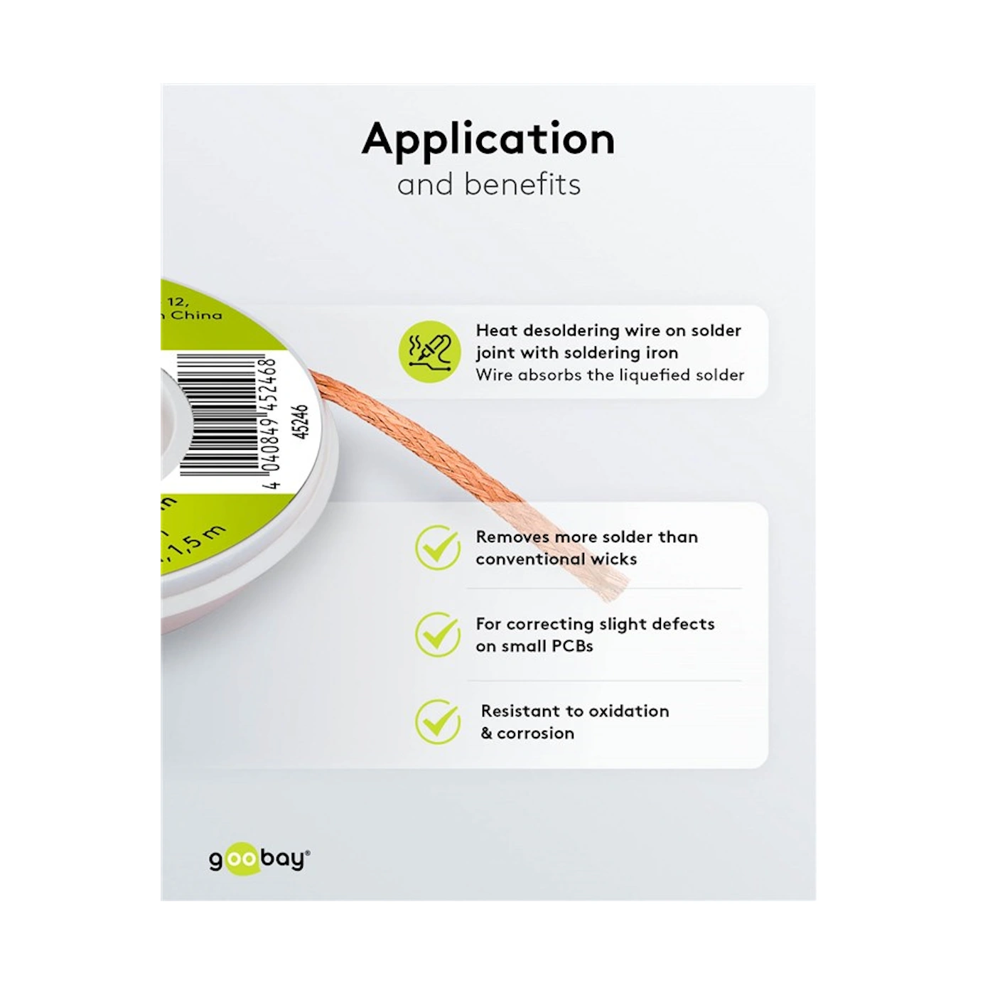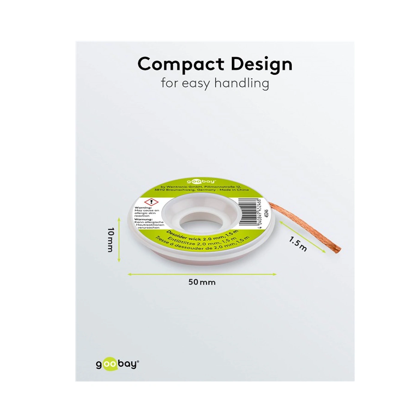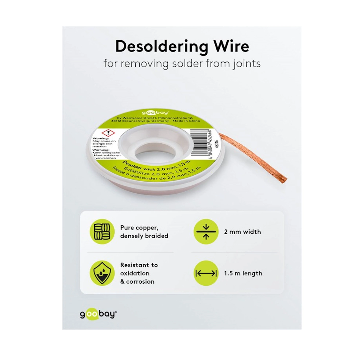 Taśma rozlutowująca 45246 (EAN: 4040849452468) to wysokiej jakości plecionka miedziana o szerokości 2 mm i długości 1,5 m, wykonana z czystej miedzi. Doskonała przewodność cieplna i kapilarność pozwalają na szybkie i czyste usuwanie nadmiaru cyny lutowniczej z punktów lutowniczych – bez pozostawiania osadu.
