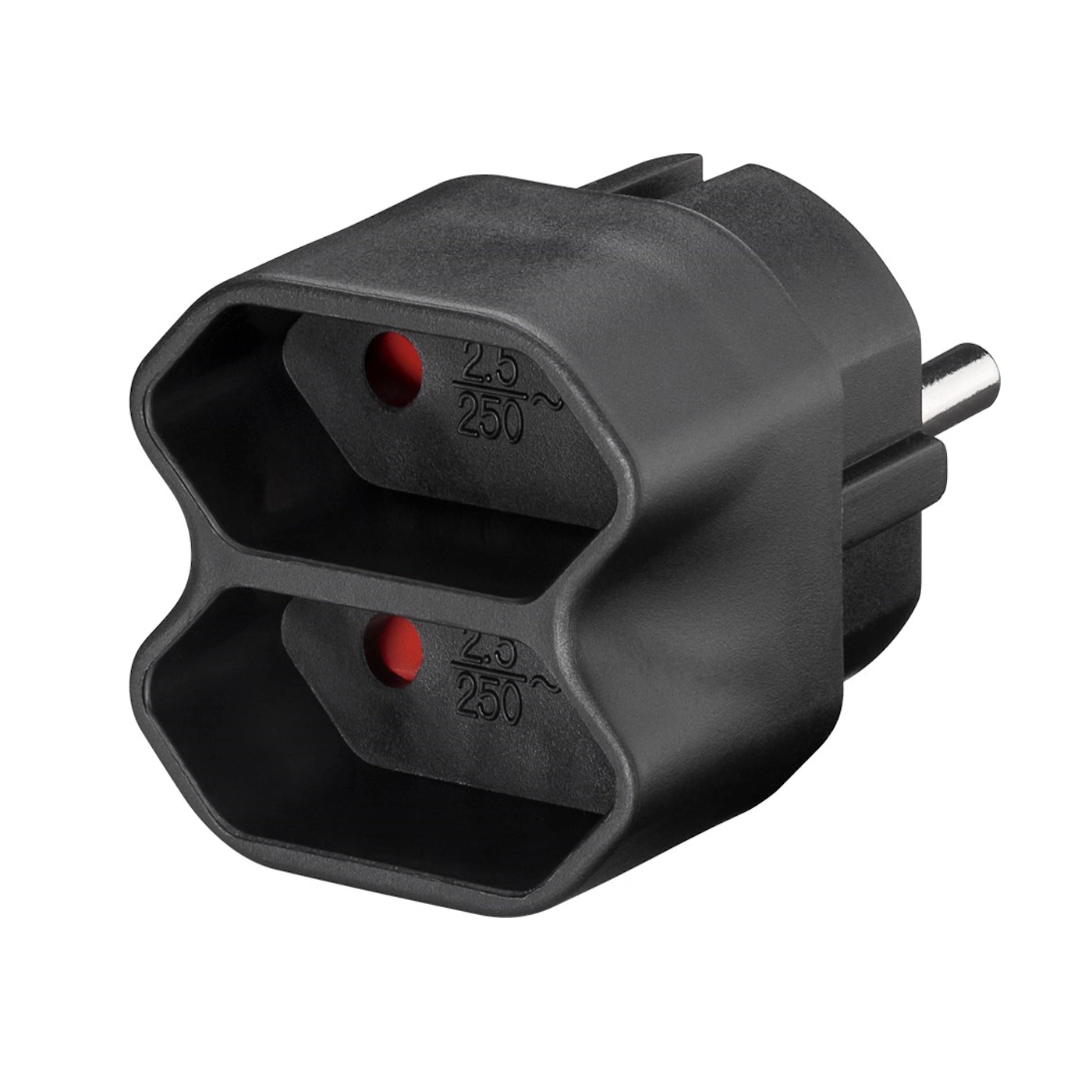 Kompaktowy adapter z 1x wtykiem europejskim (typ C, CEE 7/16) / 2 x podwójne gniazda. Idealna do użytku domowego w salonach i sypialniach. Gniazdo dystrybucyjne wielokrotne do podłączenia do 2 urządzeń elektrycznych – zamień jedno gniazdko w dwa pełne Schuko.