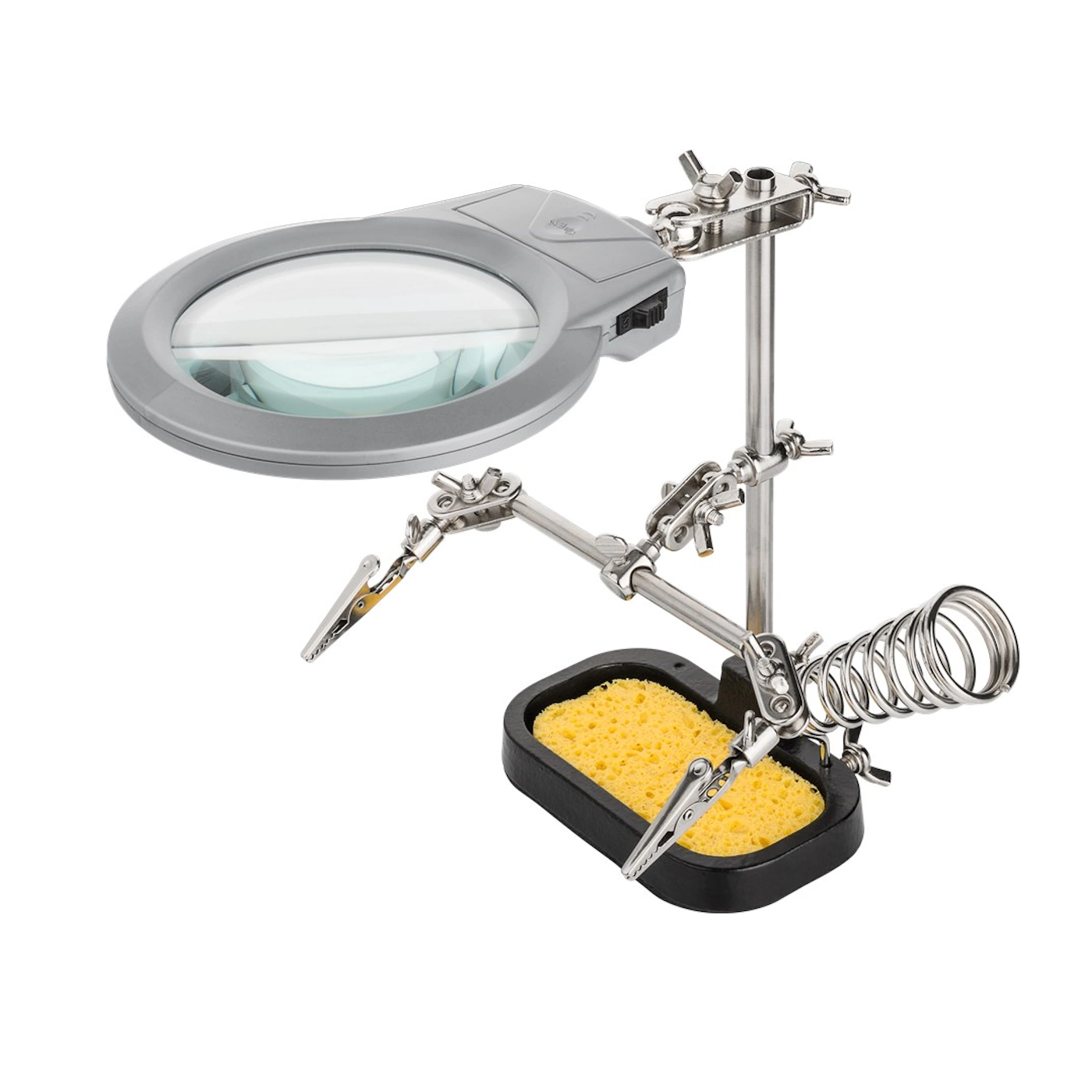 Przyrząd lutowniczy z lupą to profesjonalna „trzecia ręka” – niezbędny pomocnik przy precyzyjnym lutowaniu i montażu elektroniki. Wyposażony w dużą szklaną lupę Ø 90 mm, podświetlenie LED, 2 regulowane zaciski krokodylkowe, uchwyt na lutownicę z gąbką do czyszczenia grotu oraz ciężką żeliwną podstawę dla maksymalnej stabilności.